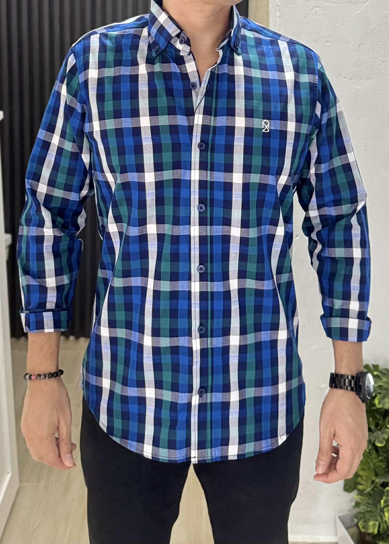 Camisa regular fit con estampado a cuadros en color marino, blanco, rojo y naranja. Una prenda fresca y versátil, ideal para esta temporada.